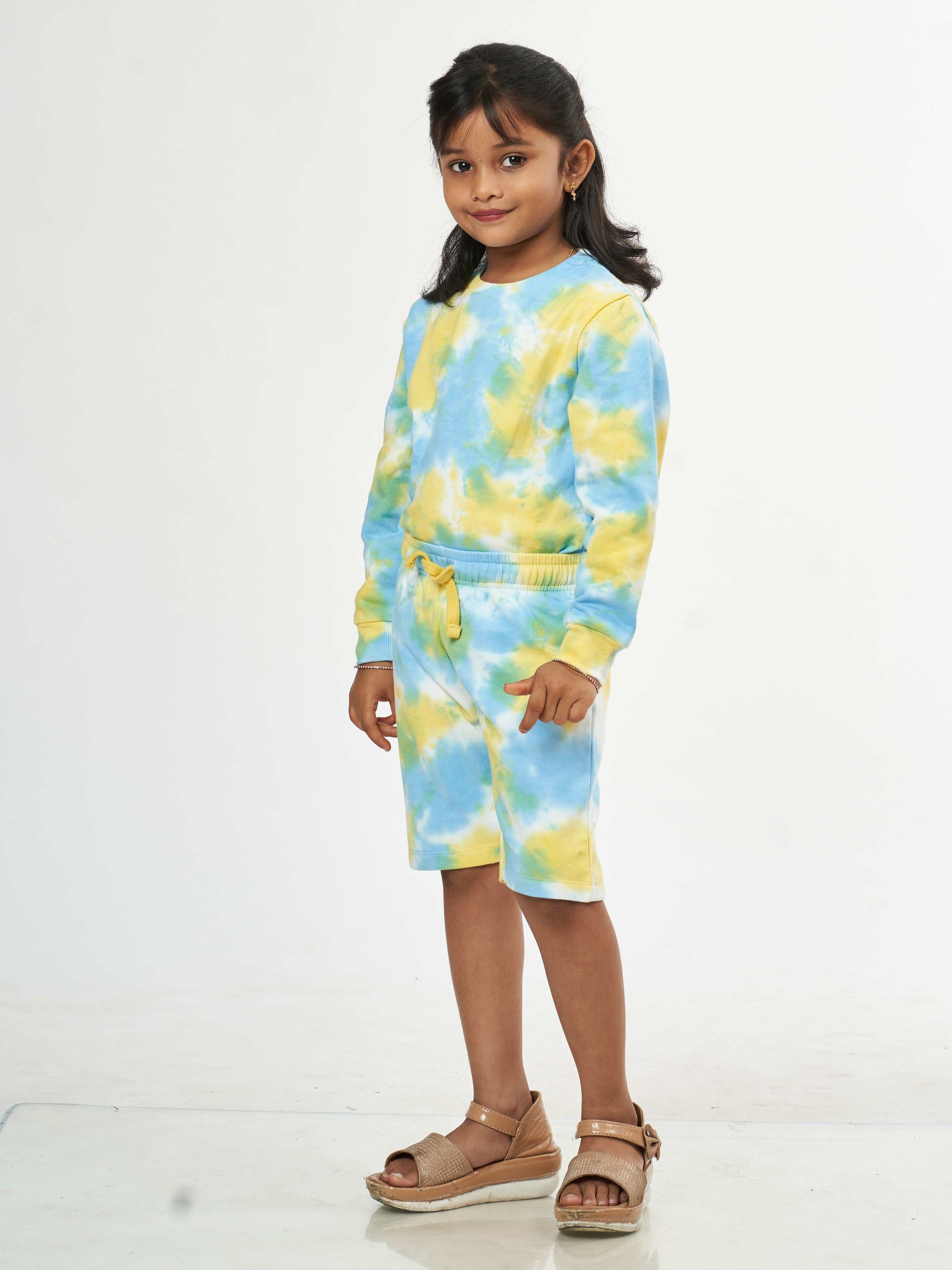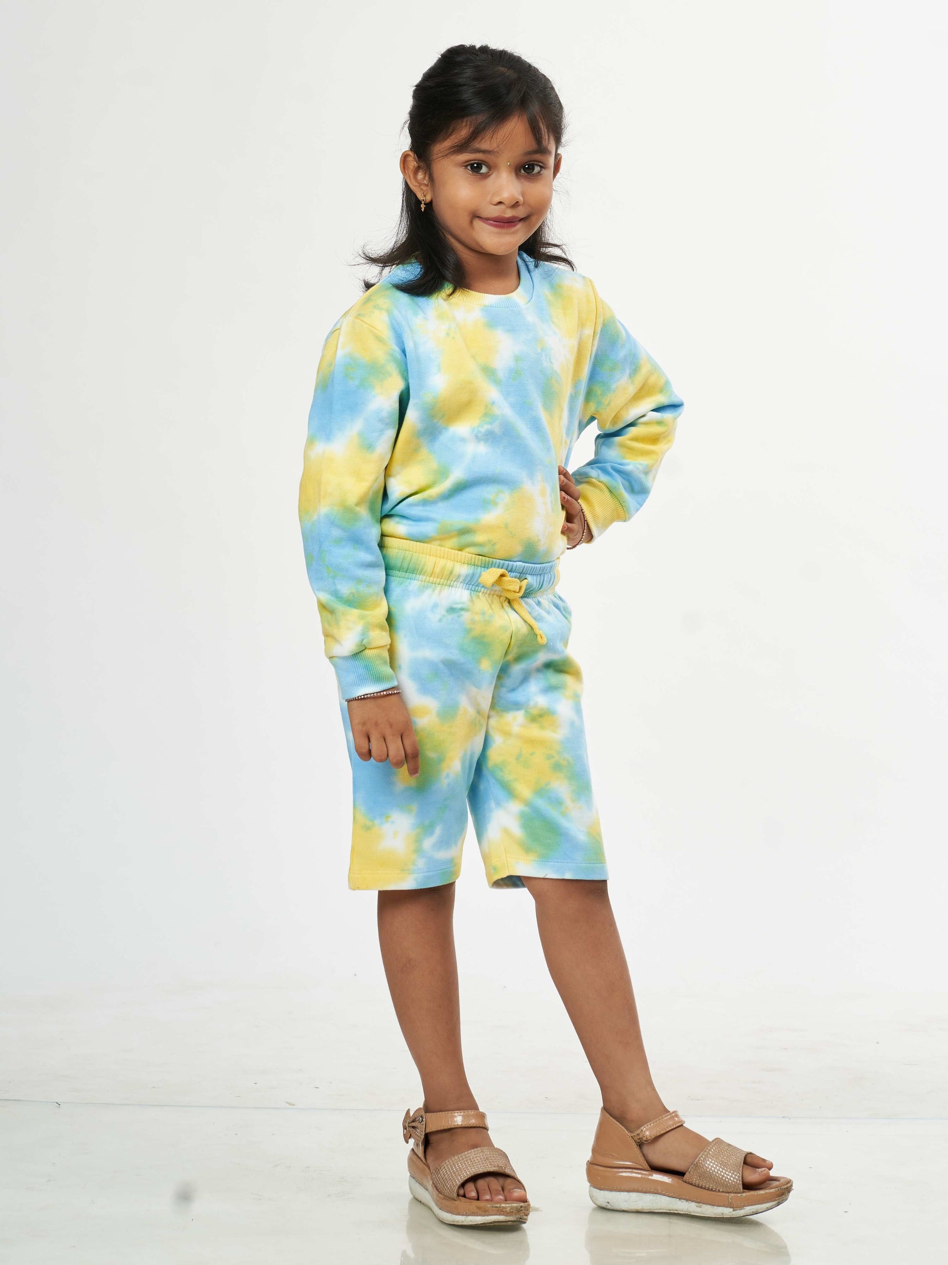 The t-shirt features a classic round neck, while the shorts have an elastic waistband for a comfortable fit. Both offers colorful tie & dye prints
