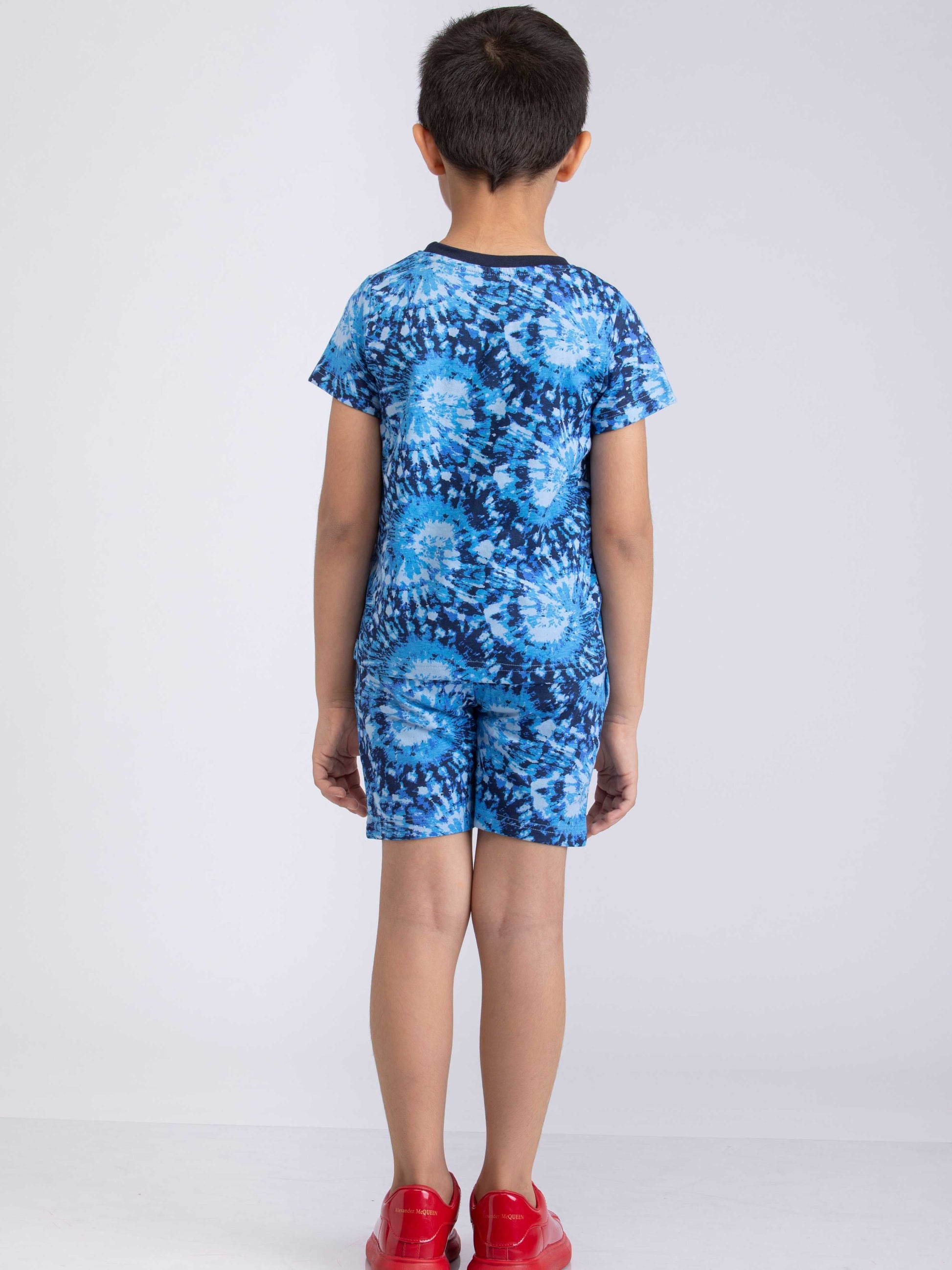 The t-shirt features a classic round neck, while the shorts have an elastic waistband for a comfortable fit. Both offers colorful tie & dye prints